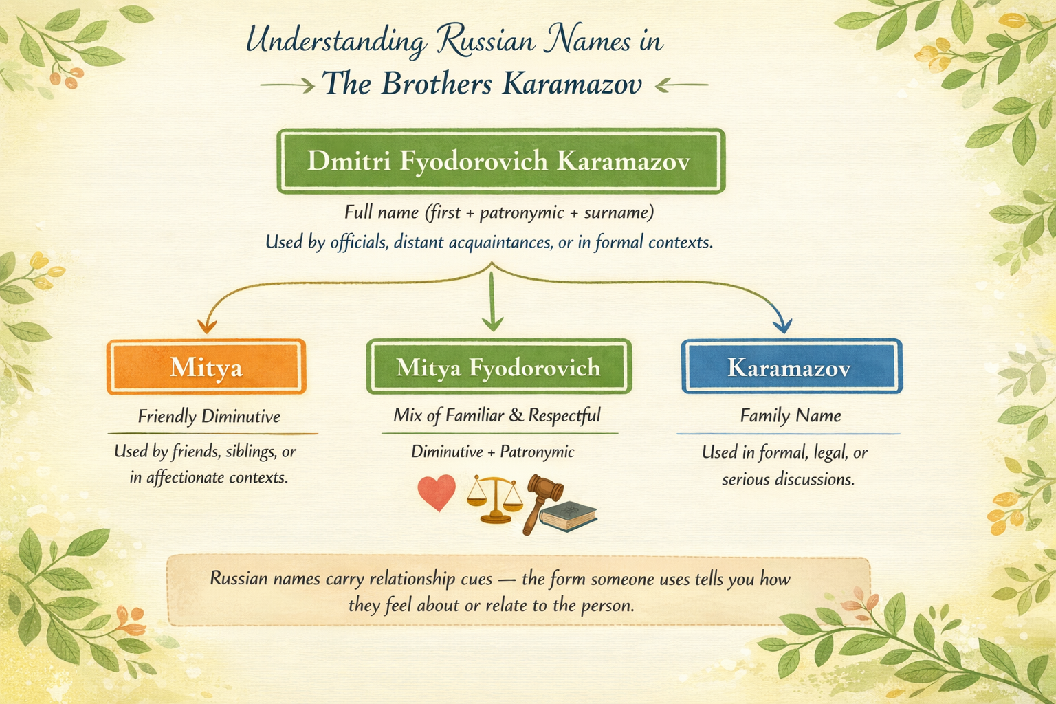 - Blended forms: Characters are addressed with both diminutive and patronymic at times, like Mitya Fyodorovich, which blends warmth (the nickname) with a layer of respect.